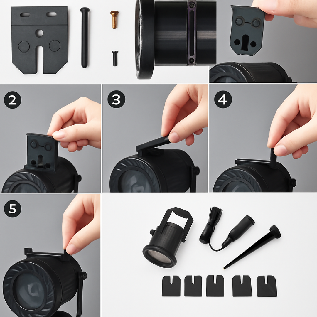 Projektor można wbić w ziemię za pomocą szpikulca lub zamontować na twardej powierzchni dzięki podstawie montażowej. Instalacja trwa kilka minut i nie wymaga żadnych narzędzi.