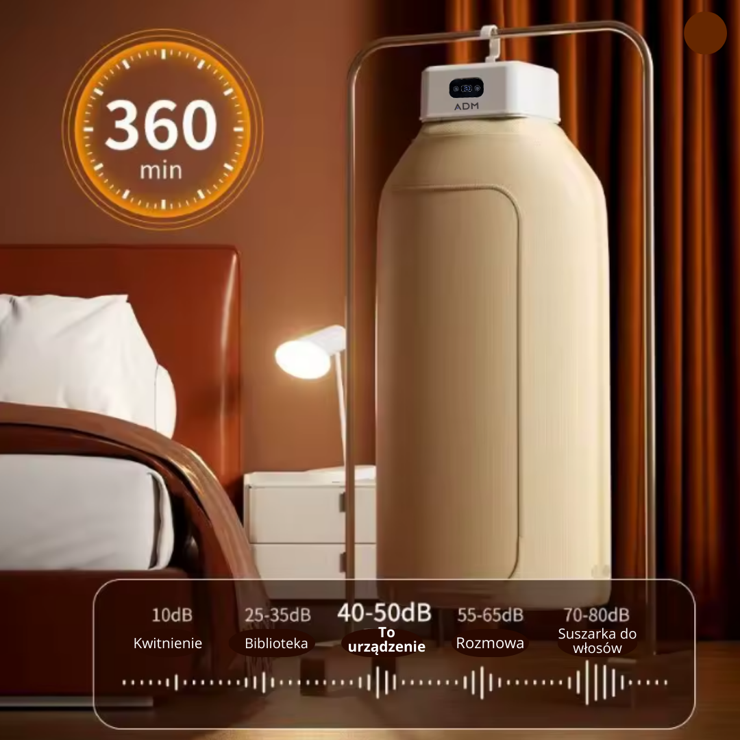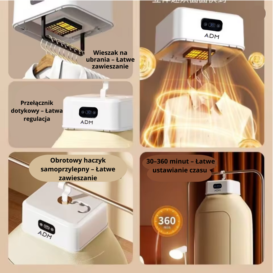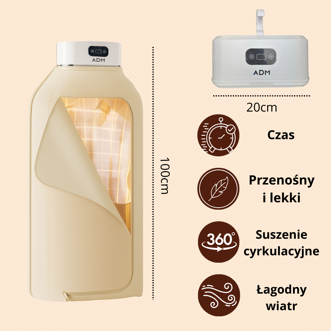 Składana suszarka do ubrań ADM to nowoczesne i kompaktowe rozwiązanie stworzone do szybkiego, skutecznego i higienicznego suszenia odzieży. Wyposażona w moc 600W, inteligentne funkcje timera oraz ochronny pokrowiec suszący, zapewnia równomierne suszenie, dbając jednocześnie o jakość tkanin. Idealnie sprawdzi się w domu, mieszkaniu, akademiku, a także w podróży, stanowiąc wygodną alternatywę dla tradycyjnych suszarek i rozbudowanych suszarek elektrycznych.